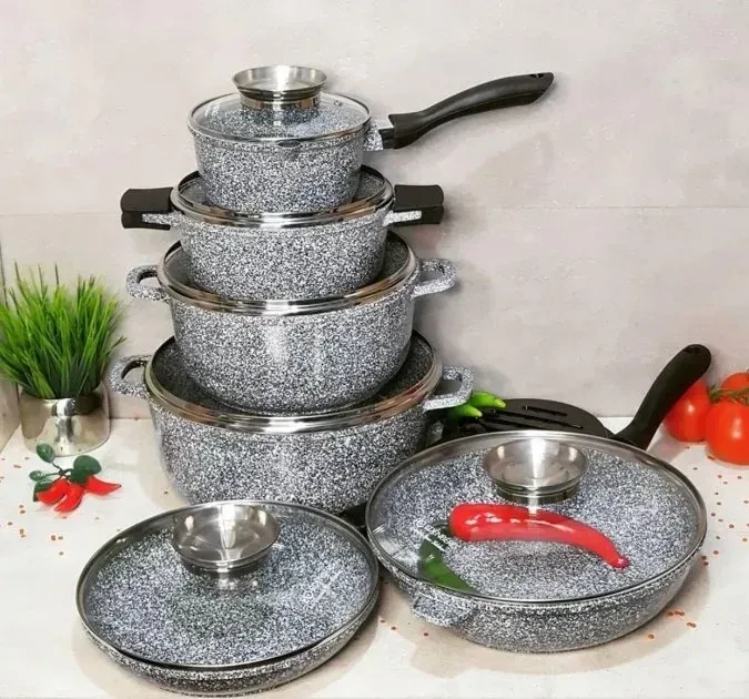 Набір з 3-х каструль, 2 сковорідок, ковшика з зовнішнім і антипригарним покриттям з мармуру. Також у наборі 2 підставки під гарячий посуд і прихватки з силікону для казанів. Набір посуду має скляні кришки з дозатором для масла, завдяки чому ви можете постійно заливати масло в тримач під час приготування або гасіння. Посуд Edenberg EB-8040 має індукційне дно, що робить їх сучасними.